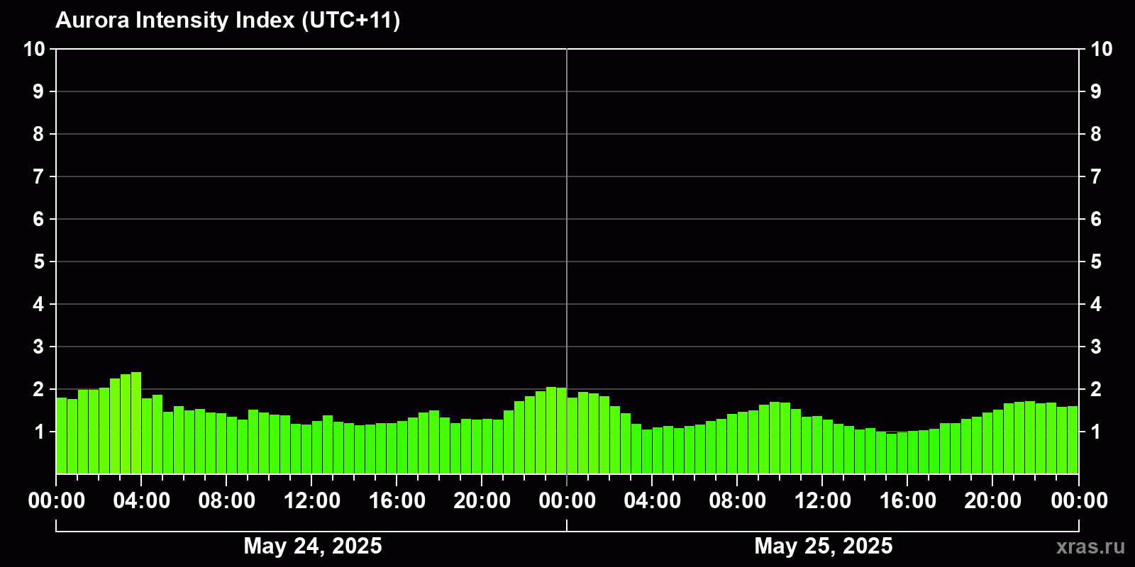Auroral intensity index and the theoretically possible latitude of observations for nighttime in the Estern Hemisphere as of 2025-05-25 23:51 (end of day) local time