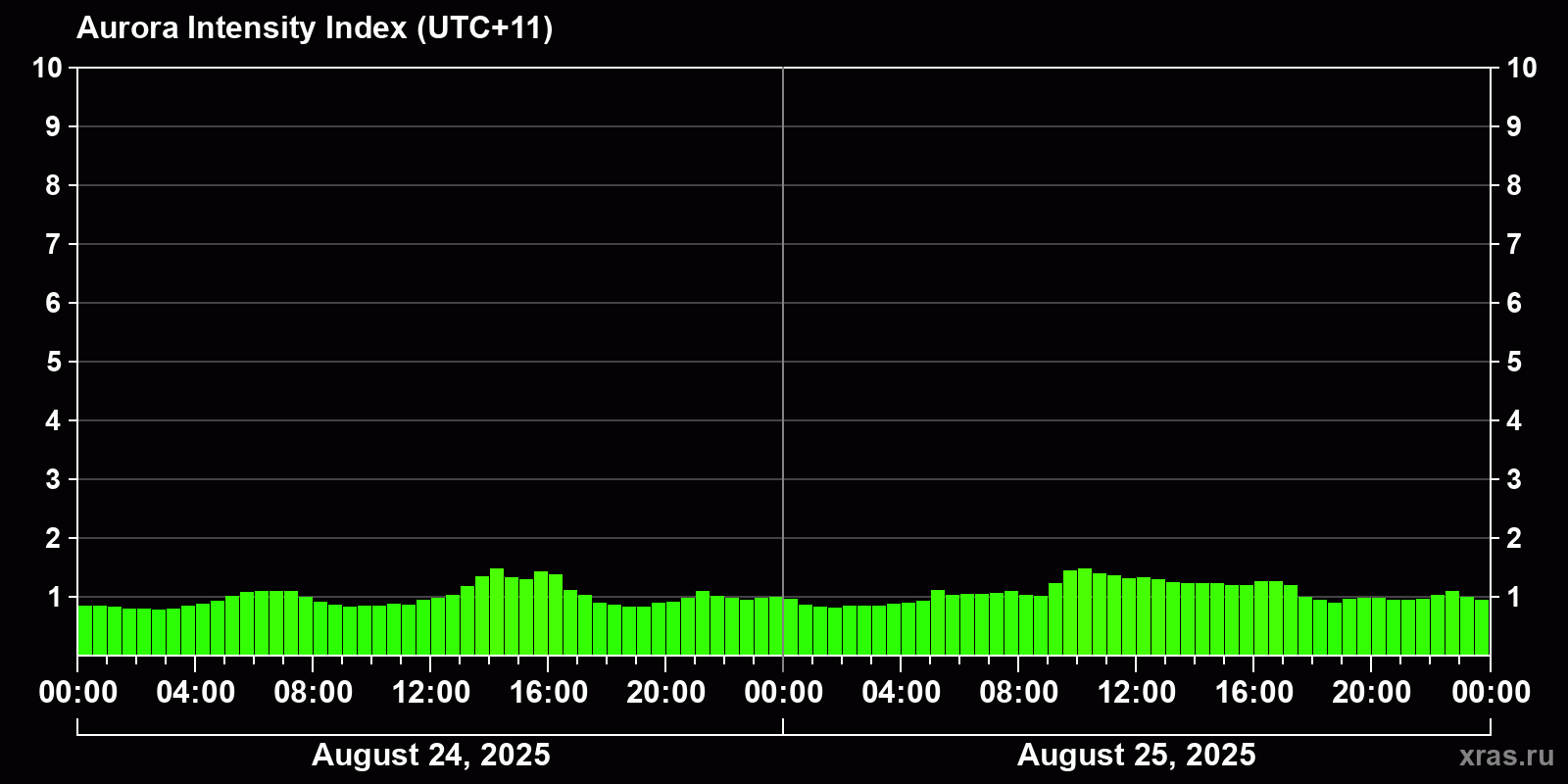 Changes in the auroral intensity index from 2025-08-24 to 2025-08-25 local time