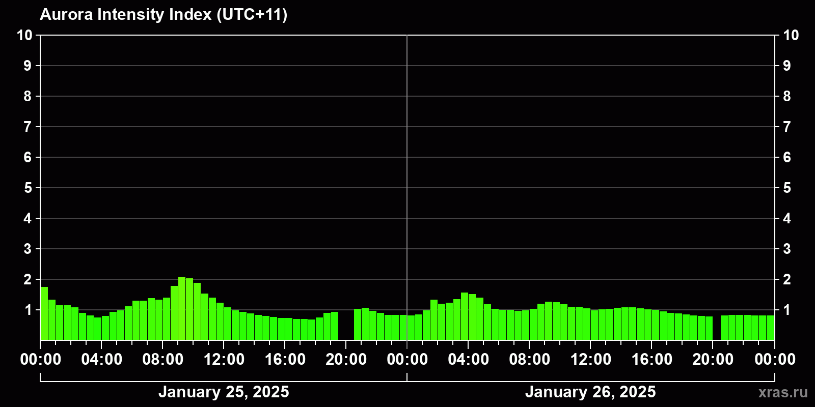 Changes in the auroral intensity index from 2025-01-25 to 2025-01-26 local time