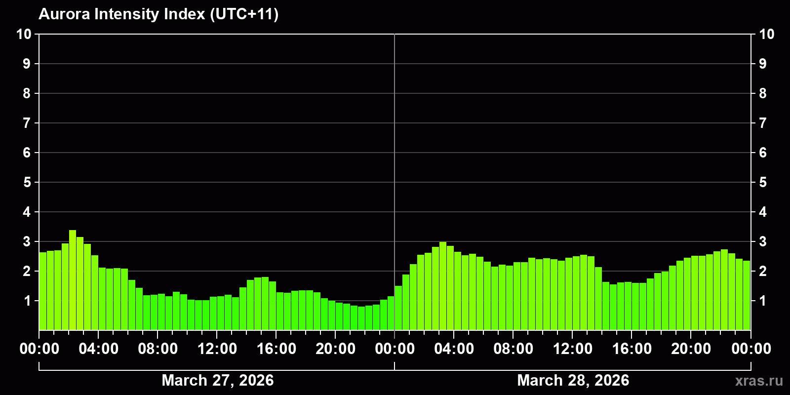 Auroral intensity index and the theoretically possible latitude of observations for nighttime in the Estern Hemisphere as of 2026-03-28 23:54 (end of day) local time