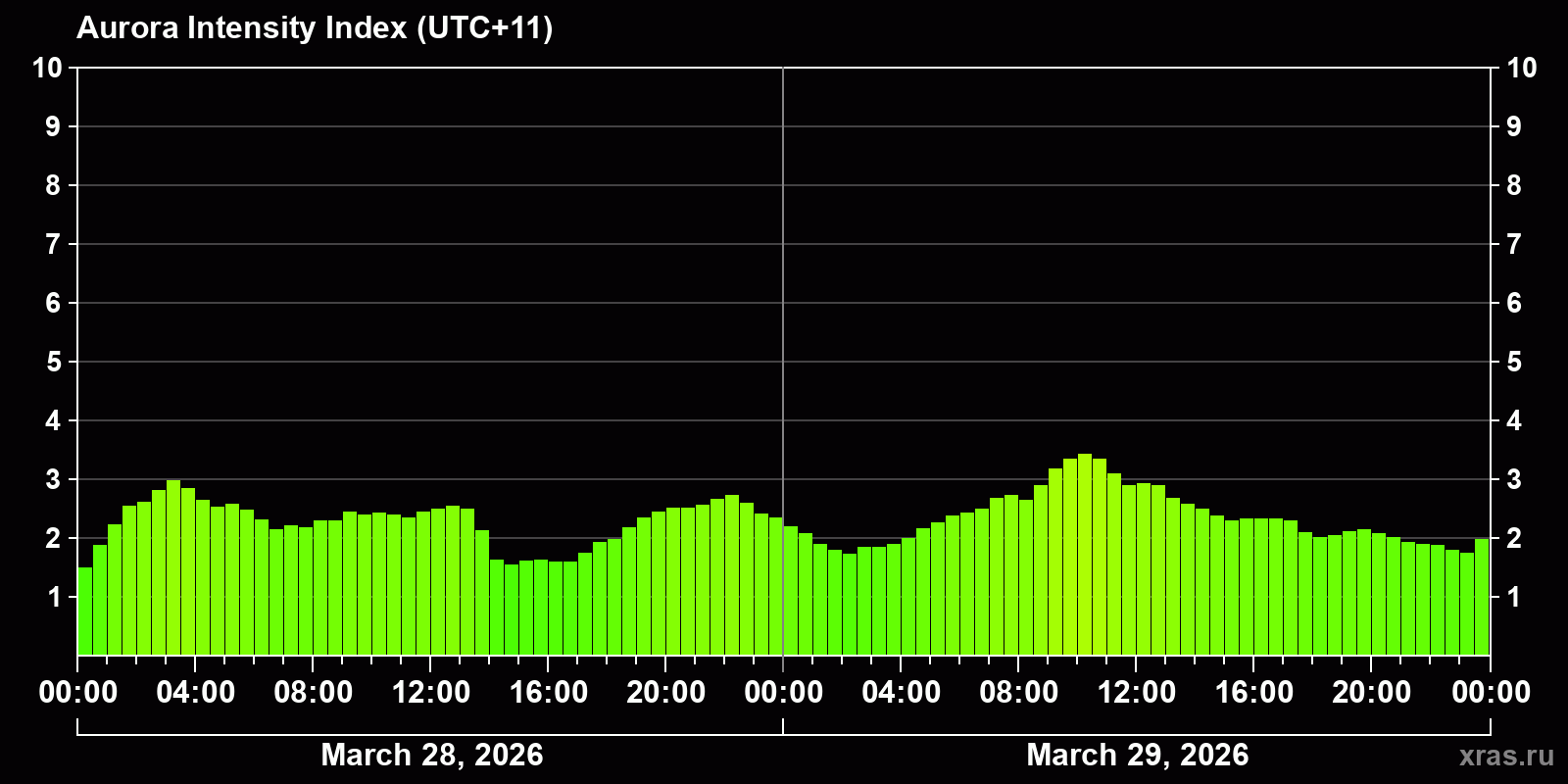 Changes in the auroral intensity index from 2026-03-28 to 2026-03-29 local time