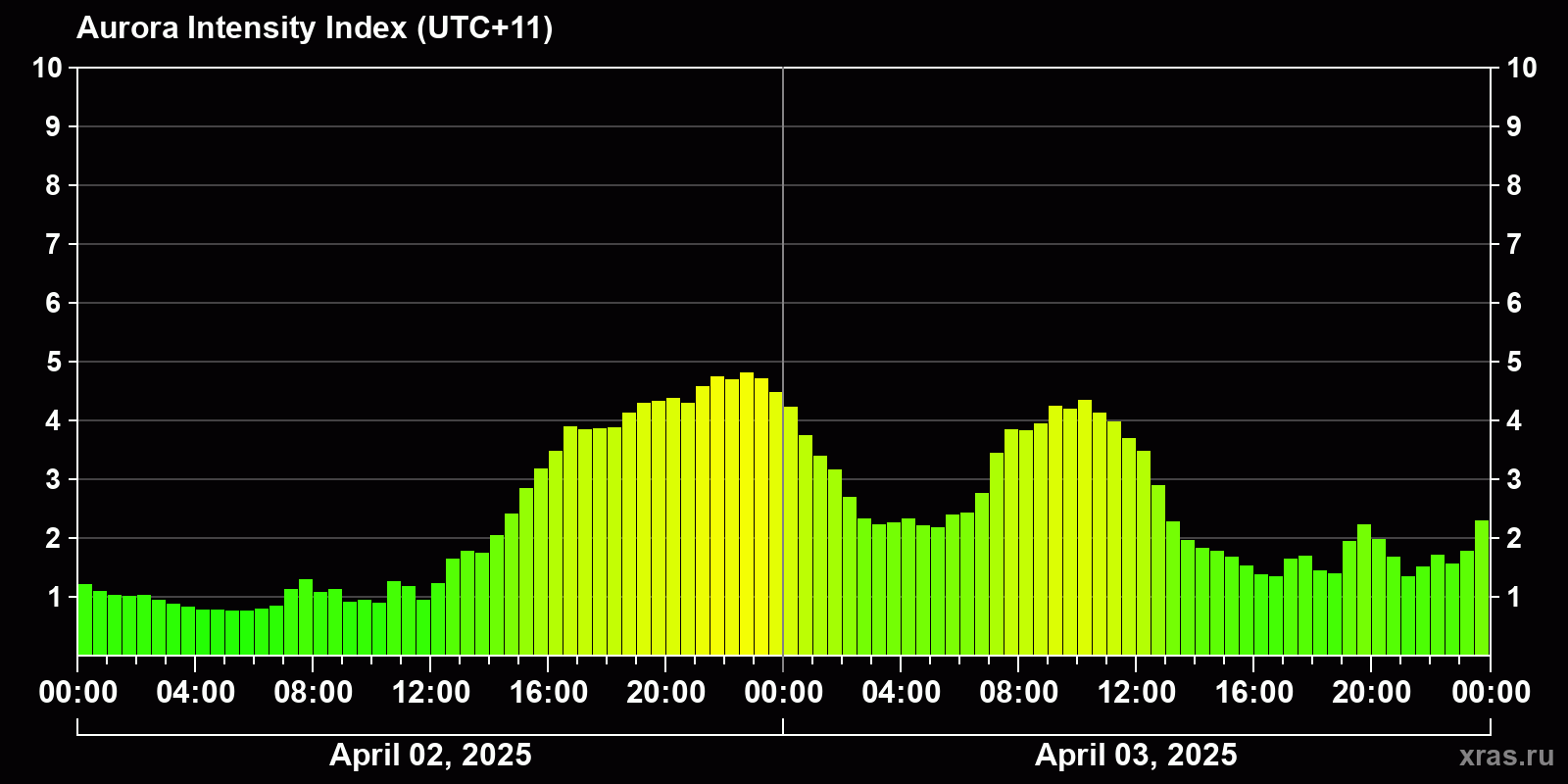 Changes in the auroral intensity index from 2025-04-02 to 2025-04-03 local time