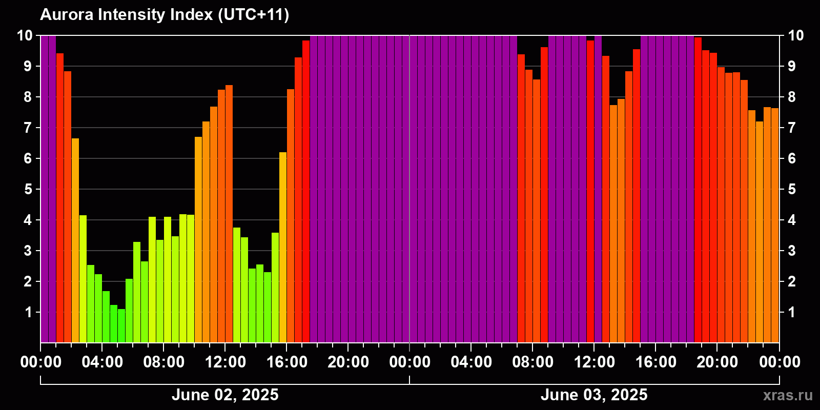 Changes in the auroral intensity index from 2025-06-02 to 2025-06-03 local time