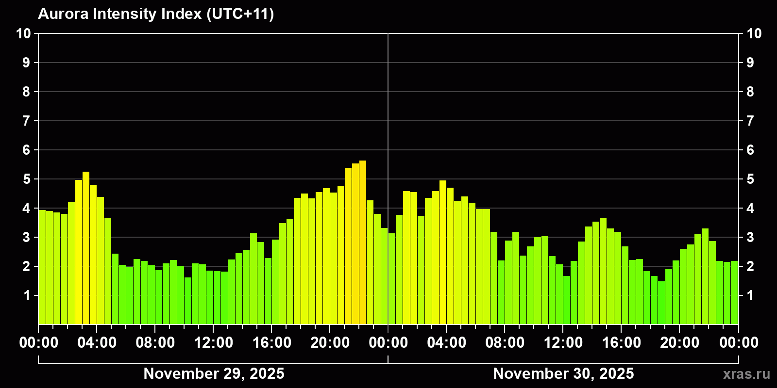 Auroral intensity index and the theoretically possible latitude of observations for nighttime in the Estern Hemisphere as of 2025-11-30 23:56 (end of day) local time