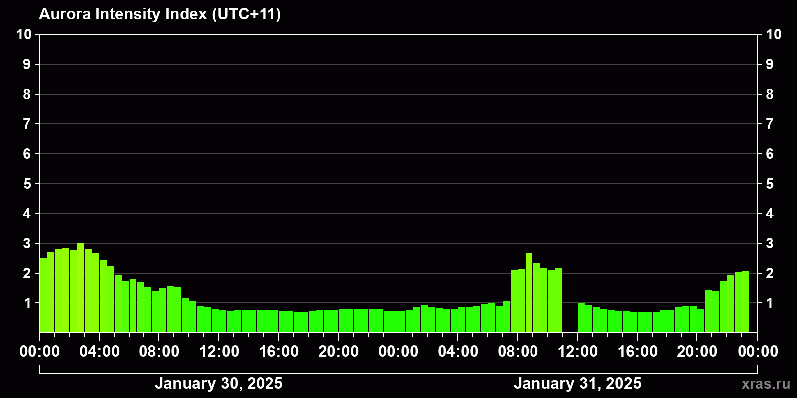 Changes in the auroral intensity index from 2025-01-30 to 2025-01-31 local time