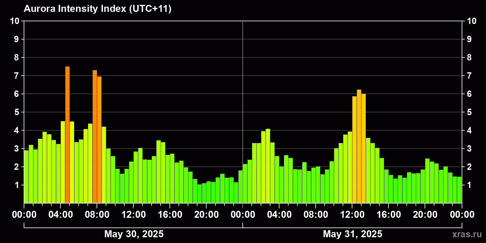 Changes in the auroral intensity index from 2025-05-30 to 2025-05-31 local time