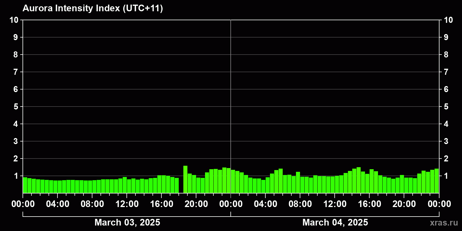 Changes in the auroral intensity index from 2025-03-03 to 2025-03-04 local time