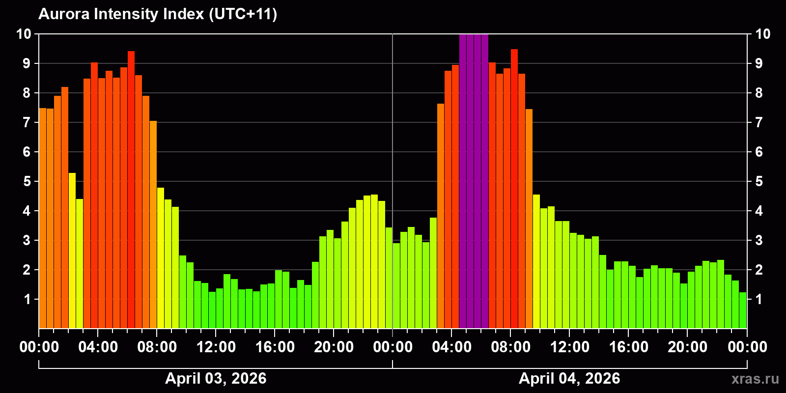 Changes in the auroral intensity index from 2026-04-03 to 2026-04-04 local time