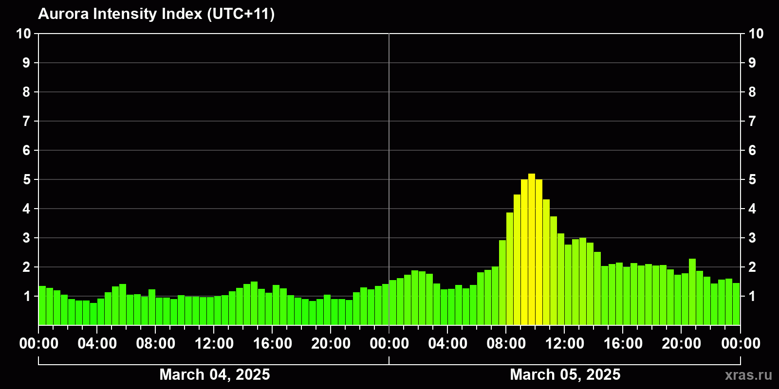 Changes in the auroral intensity index from 2025-03-04 to 2025-03-05 local time