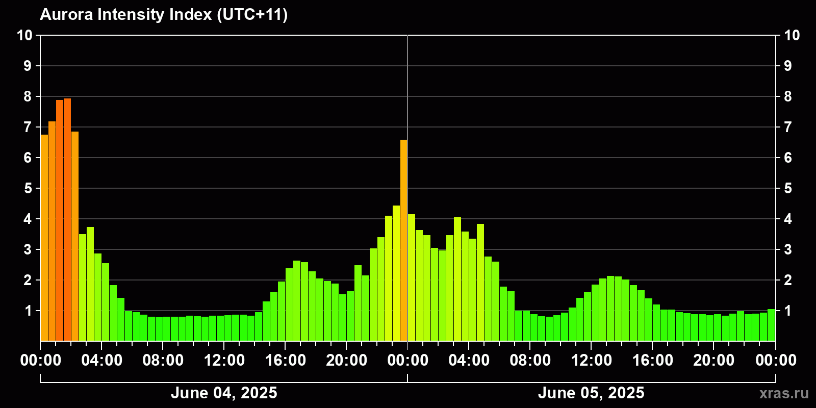 Changes in the auroral intensity index from 2025-06-04 to 2025-06-05 local time