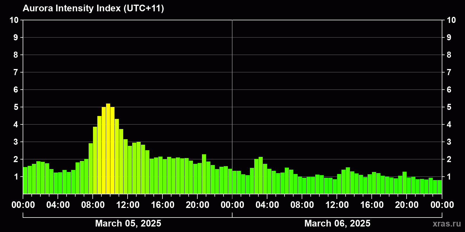 Changes in the auroral intensity index from 2025-03-05 to 2025-03-06 local time