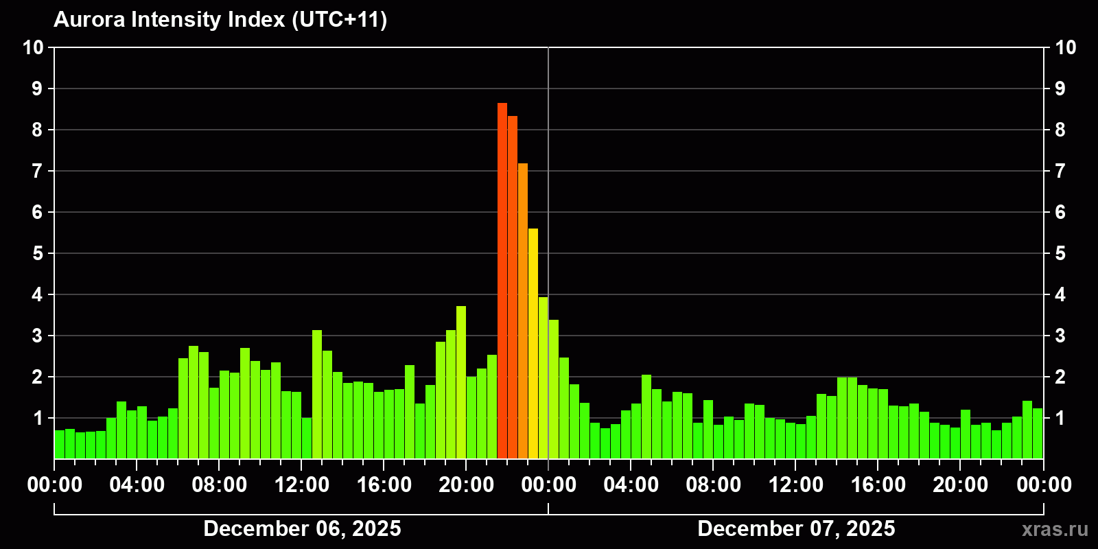 Changes in the auroral intensity index from 2025-12-06 to 2025-12-07 local time