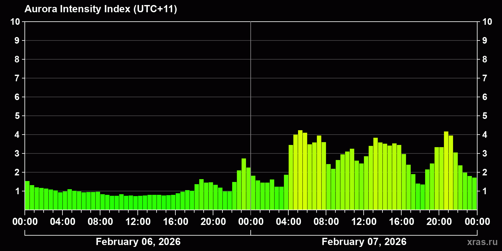 Auroral intensity index and the theoretically possible latitude of observations for nighttime in the Estern Hemisphere as of 2026-02-07 23:48 (end of day) local time