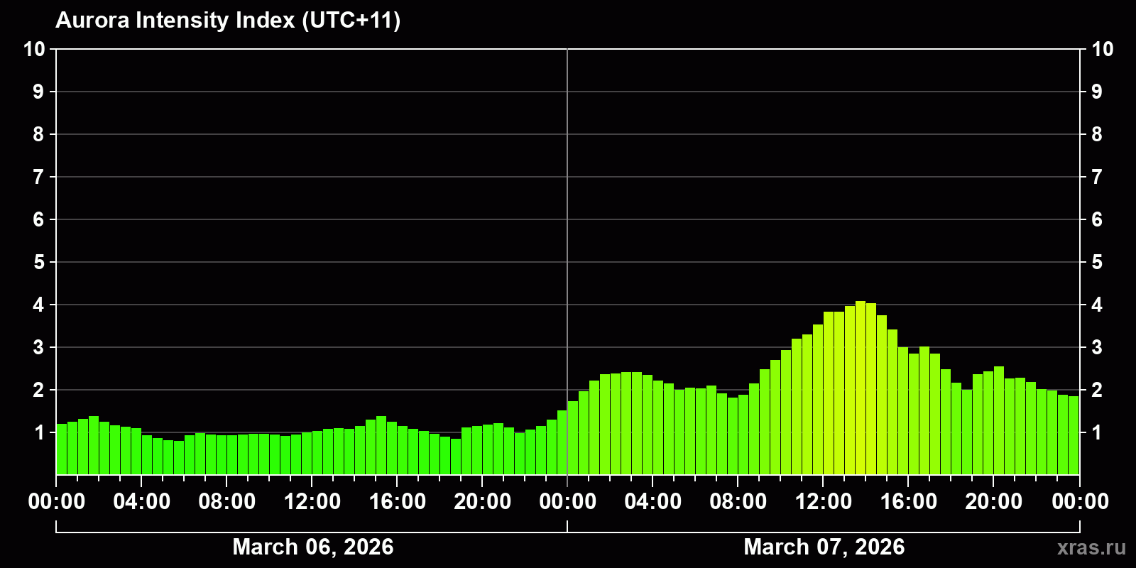 Changes in the auroral intensity index from 2026-03-06 to 2026-03-07 local time