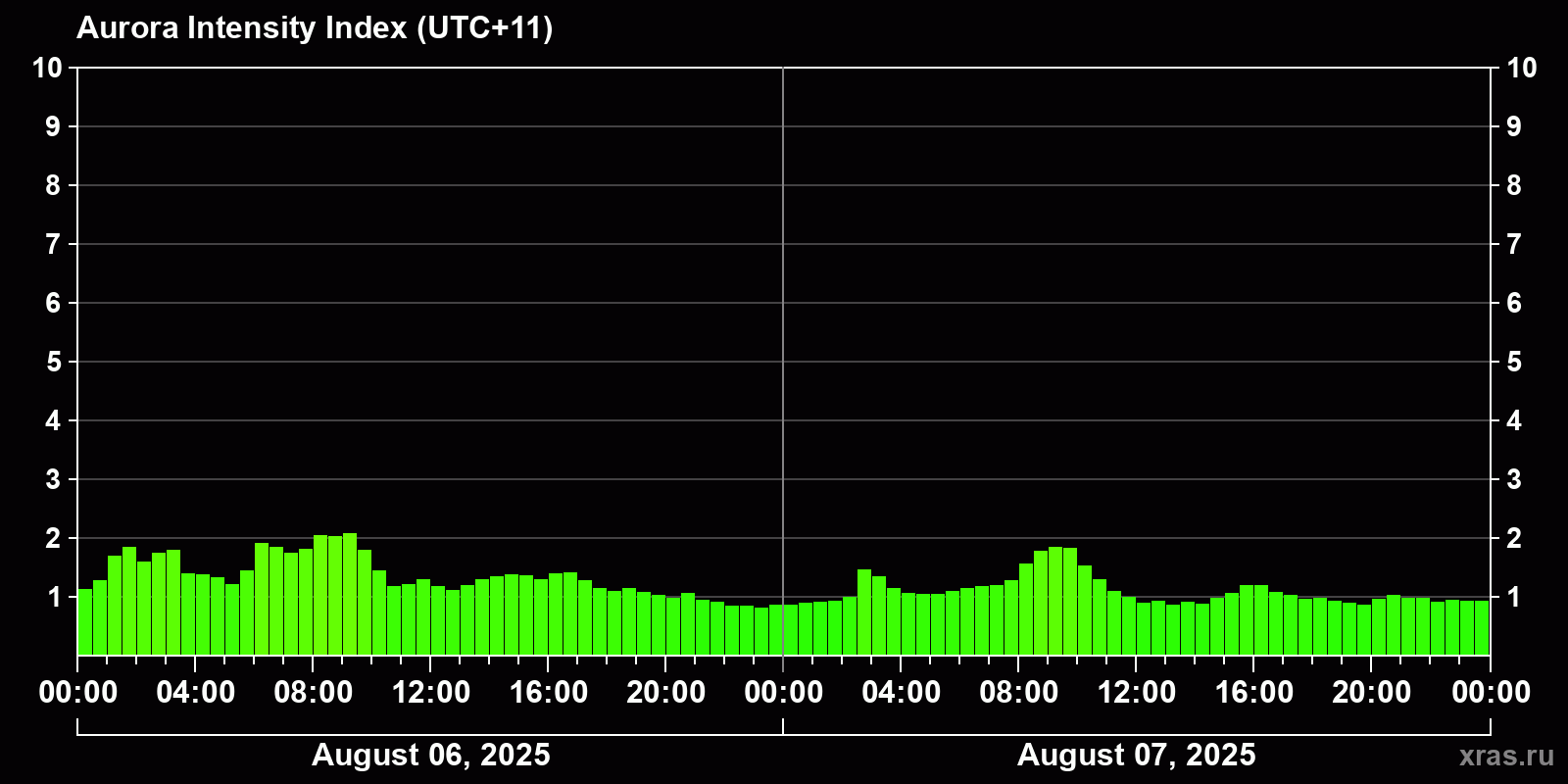 Changes in the auroral intensity index from 2025-08-06 to 2025-08-07 local time