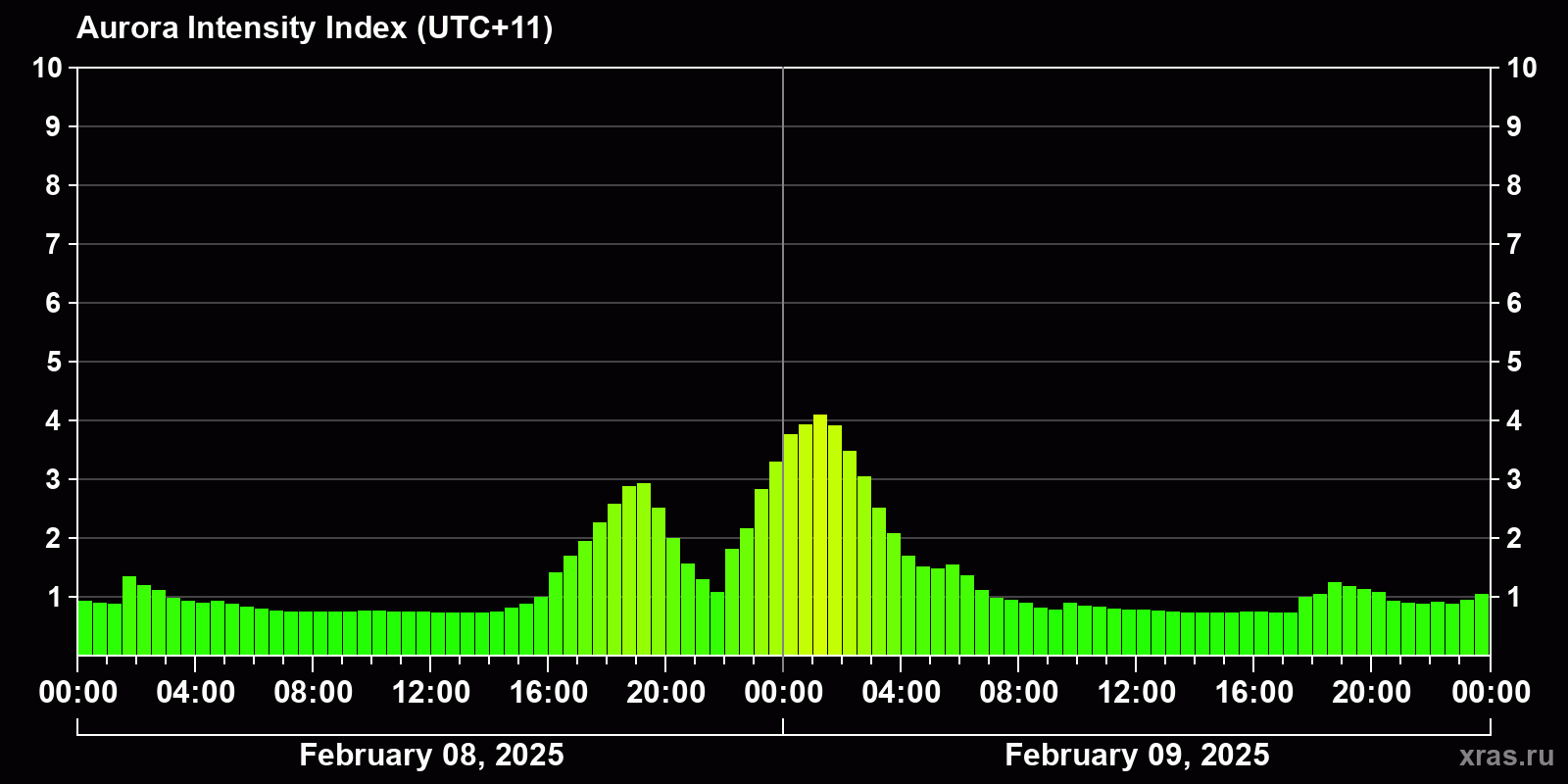 Changes in the auroral intensity index from 2025-02-08 to 2025-02-09 local time
