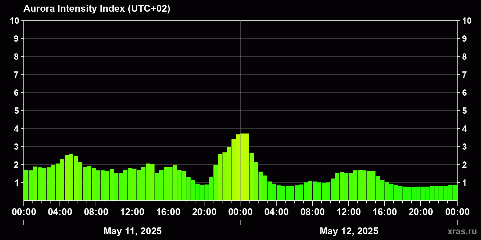 Auroral intensity index and the theoretically possible latitude of observations for nighttime in the Estern Hemisphere as of 2025-05-12 23:45 (end of day) local time