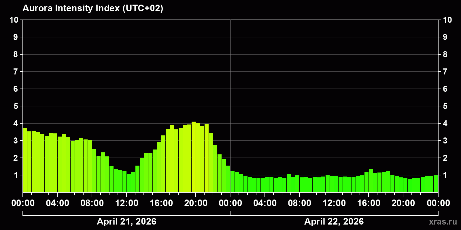 Changes in the auroral intensity index from 2026-04-21 to 2026-04-22 local time