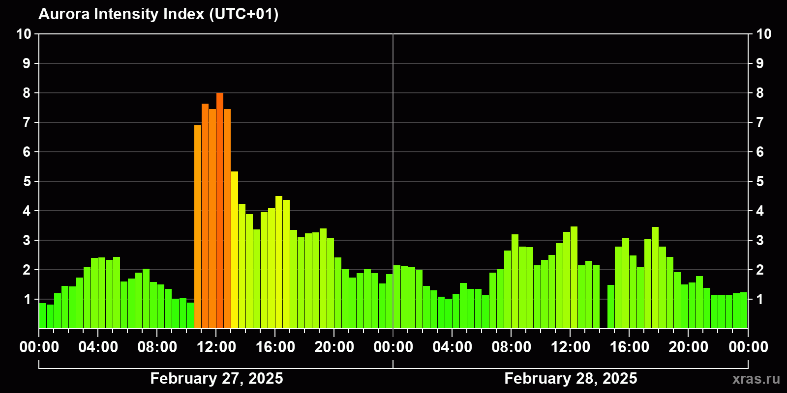 Changes in the auroral intensity index from 2025-02-27 to 2025-02-28 local time