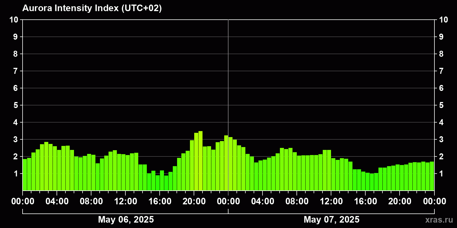 Auroral intensity index and the theoretically possible latitude of observations for nighttime in the Estern Hemisphere as of 2025-05-07 23:49 (end of day) local time