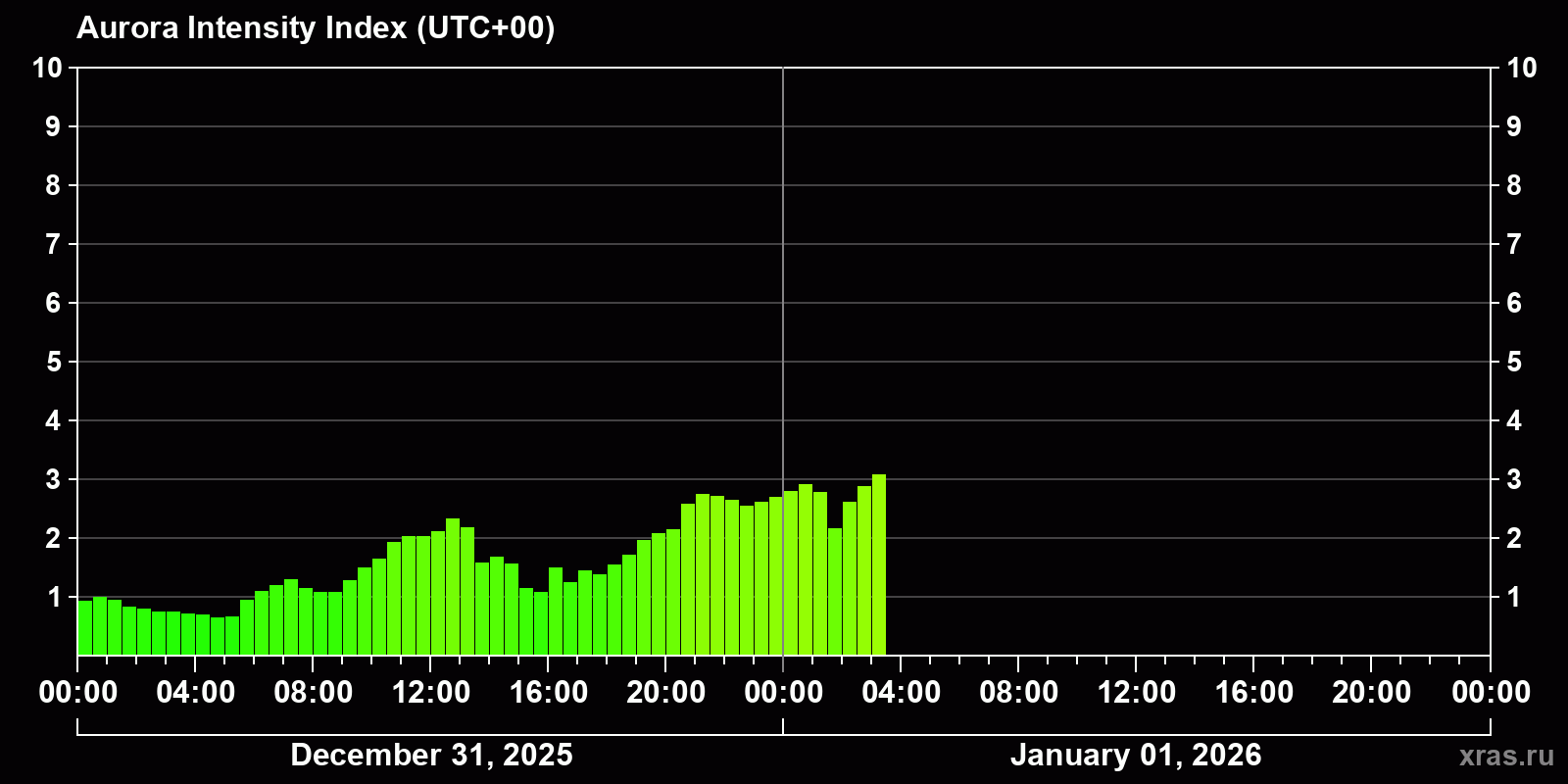 Auroral intensity index and the theoretically possible latitude of observations for nighttime in the Estern Hemisphere as of 2026-01-01 01:29 (end of day) local time