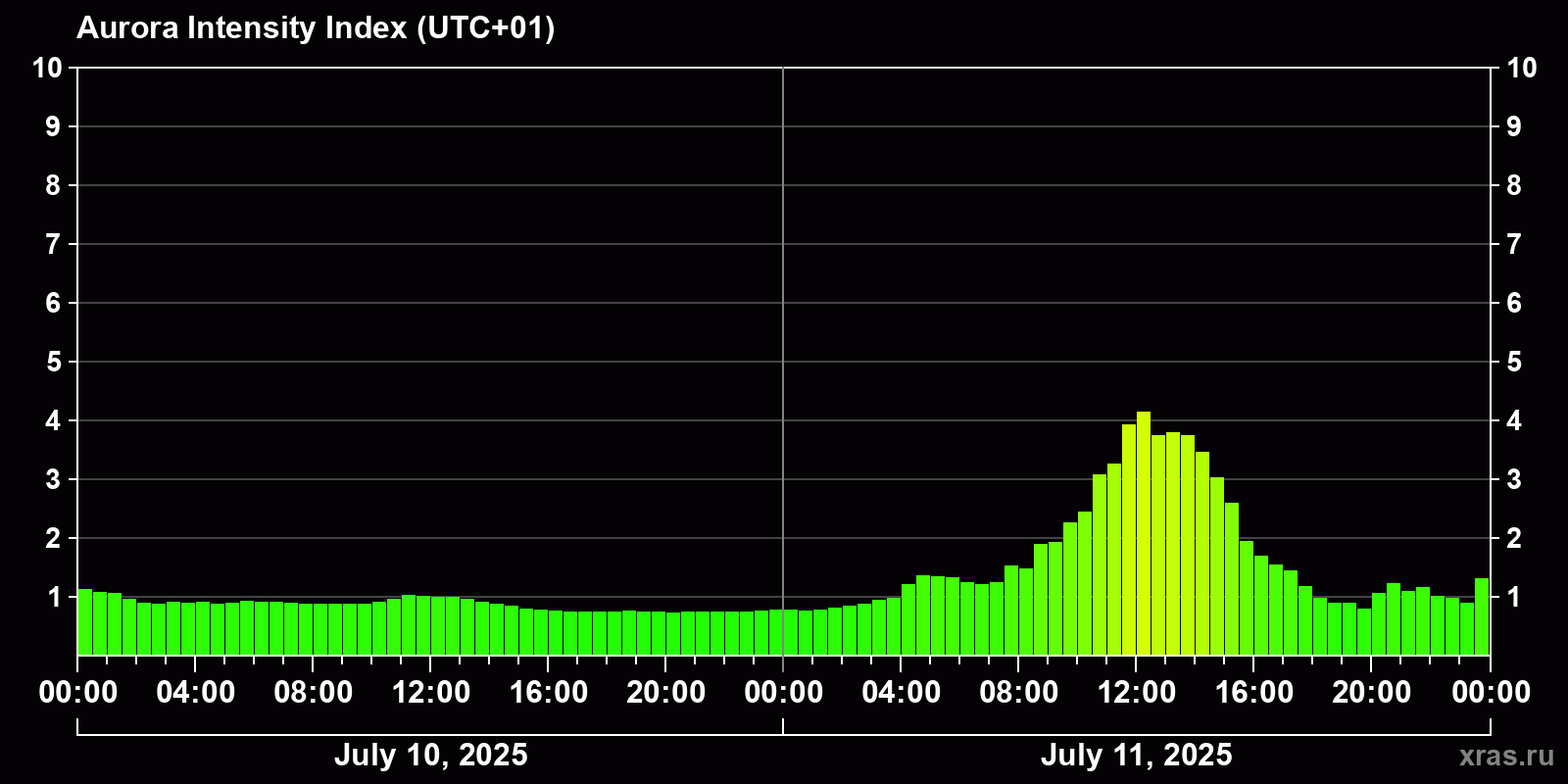 Changes in the auroral intensity index from 2025-07-10 to 2025-07-11 local time