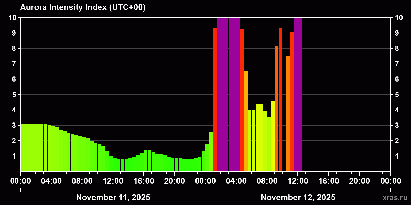 Auroral intensity index and the theoretically possible latitude of observations for nighttime in the Estern Hemisphere as of 2025-11-12 10:01 (end of day) local time