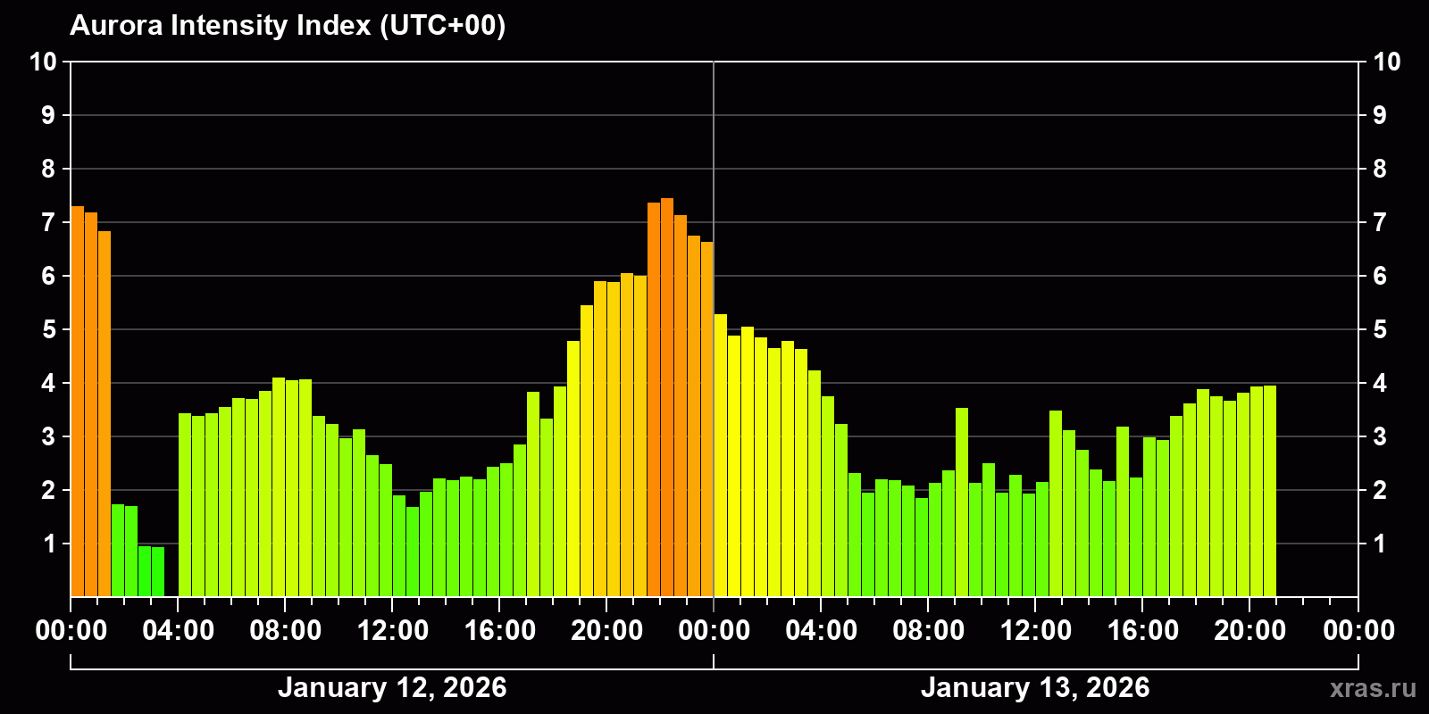 Auroral intensity index and the theoretically possible latitude of observations for nighttime in the Estern Hemisphere as of 2026-01-13 19:10 (end of day) local time