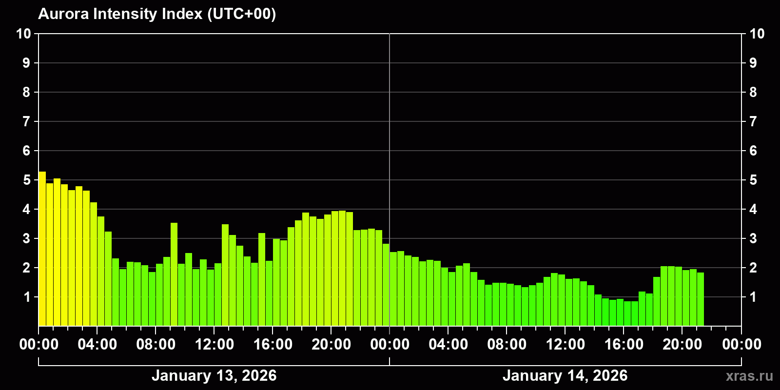 Auroral intensity index and the theoretically possible latitude of observations for nighttime in the Estern Hemisphere as of 2026-01-14 19:28 (end of day) local time