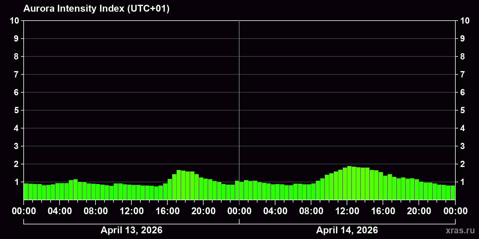 Changes in the auroral intensity index from 2026-04-13 to 2026-04-14 local time