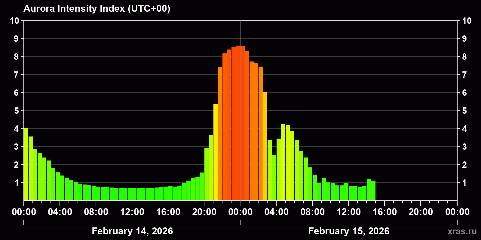 Auroral intensity index and the theoretically possible latitude of observations for nighttime in the Estern Hemisphere as of 2026-02-15 13:22 (end of day) local time