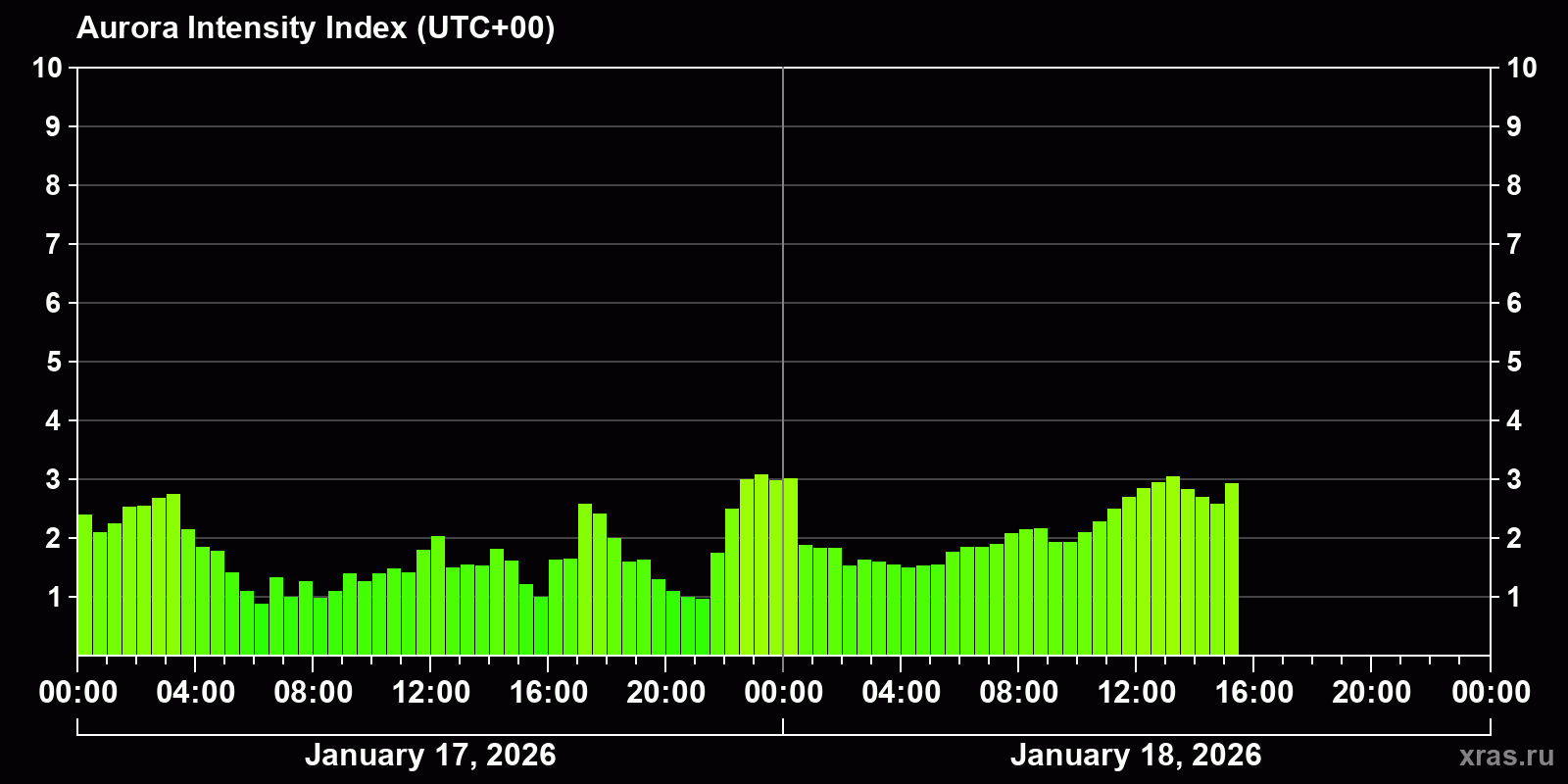 Auroral intensity index and the theoretically possible latitude of observations for nighttime in the Estern Hemisphere as of 2026-01-18 13:13 (end of day) local time