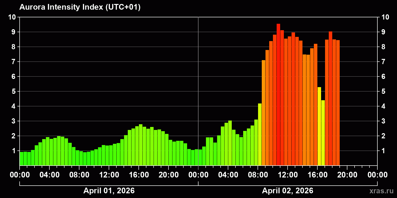 Auroral intensity index and the theoretically possible latitude of observations for nighttime in the Estern Hemisphere as of 2026-04-02 11:23 (end of day) local time