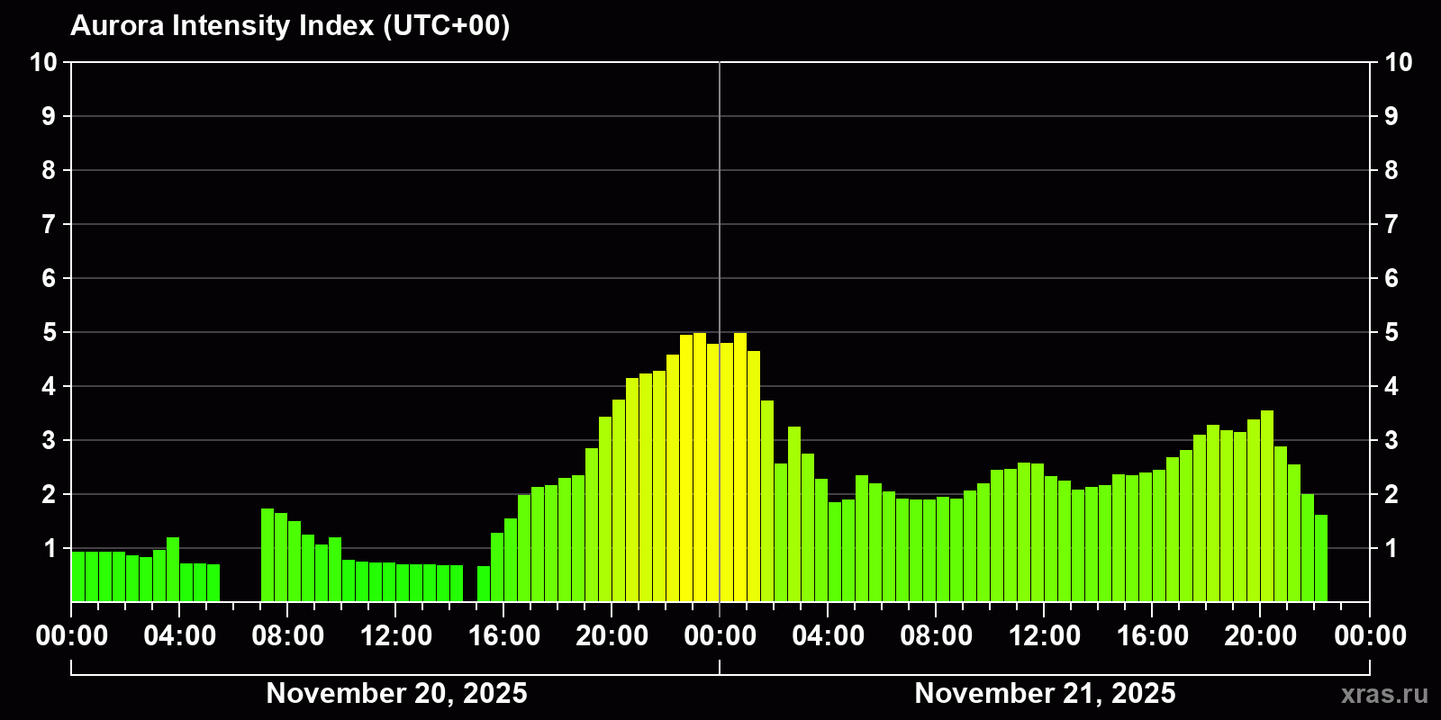 Auroral intensity index and the theoretically possible latitude of observations for nighttime in the Estern Hemisphere as of 2025-11-21 21:34 (end of day) local time