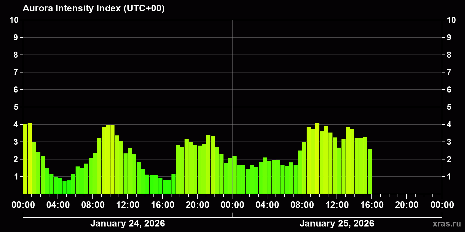 Changes in the auroral intensity index from 2026-01-24 to 2026-01-25 local time