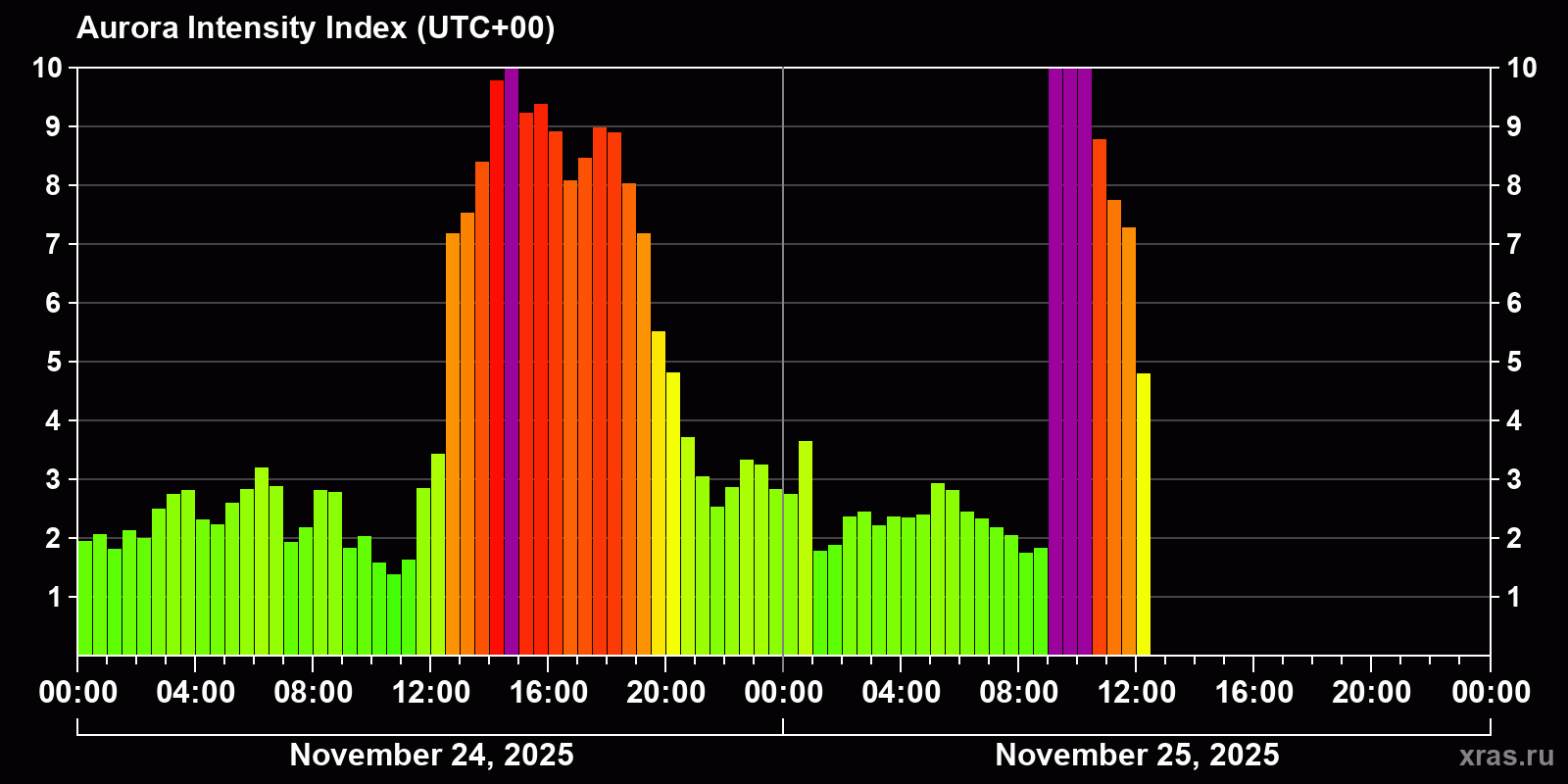 Auroral intensity index and the theoretically possible latitude of observations for nighttime in the Estern Hemisphere as of 2025-11-25 10:18 (end of day) local time
