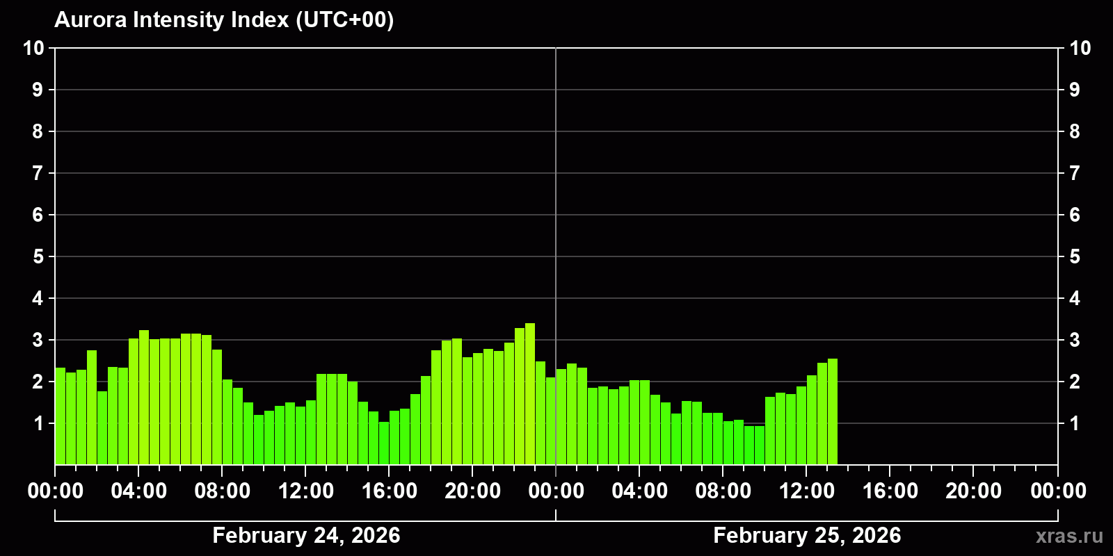 Auroral intensity index and the theoretically possible latitude of observations for nighttime in the Estern Hemisphere as of 2026-02-25 11:44 (end of day) local time
