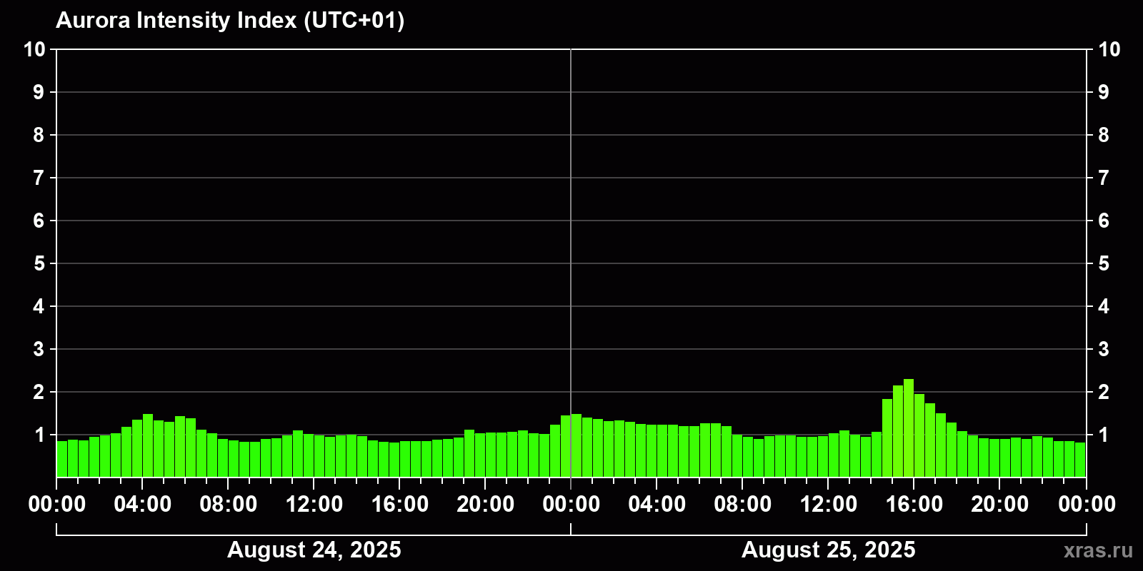 Auroral intensity index and the theoretically possible latitude of observations for nighttime in the Estern Hemisphere as of 2025-08-26 00:53 (end of day) local time