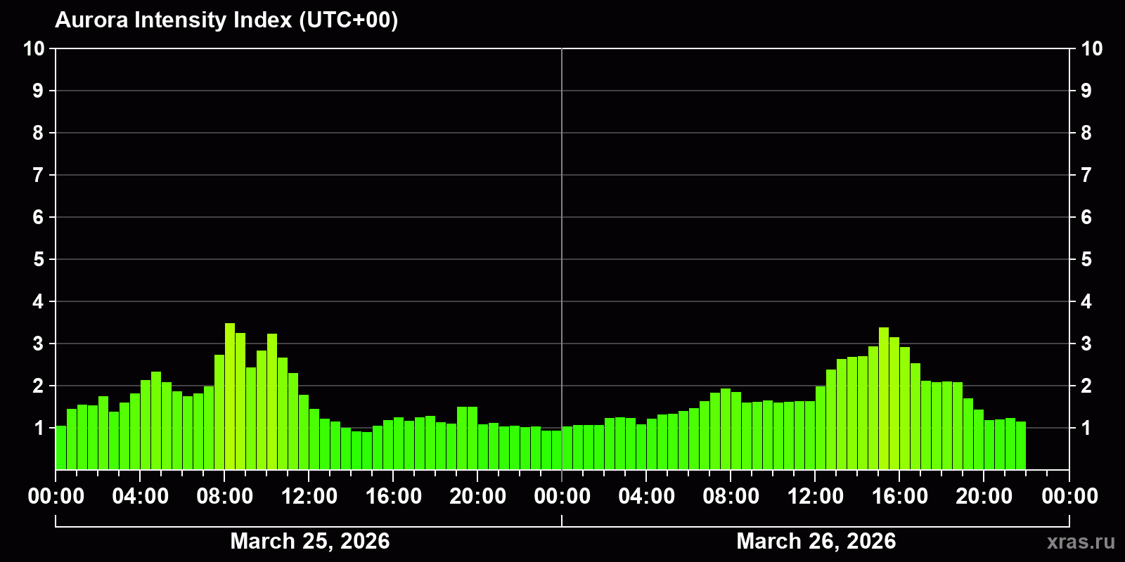 Changes in the auroral intensity index from 2026-03-25 to 2026-03-26 local time