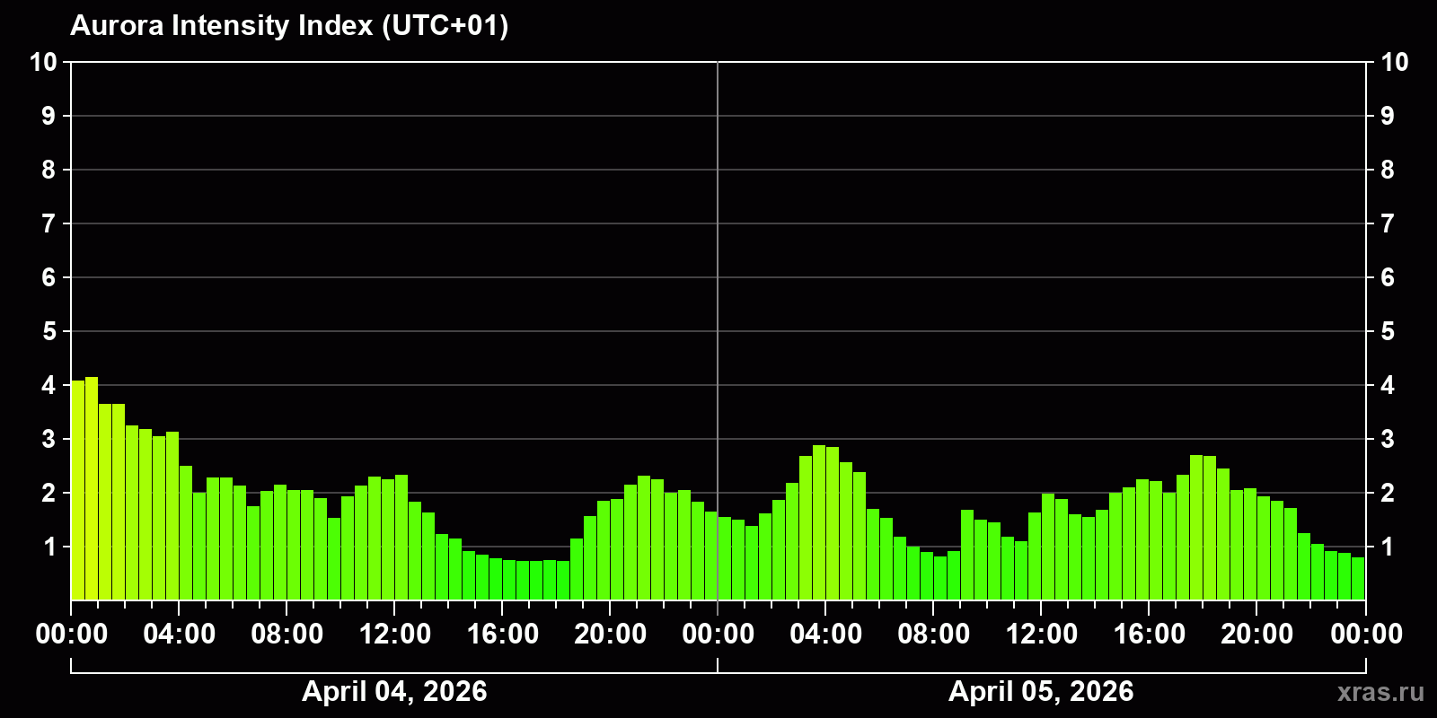 Changes in the auroral intensity index from 2026-04-04 to 2026-04-05 local time
