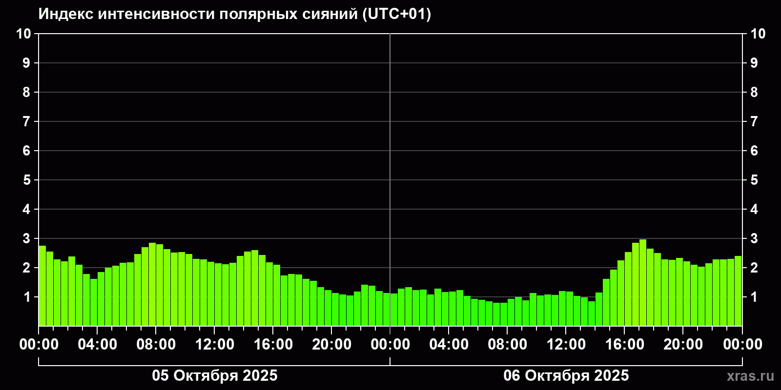 Auroral intensity index and the theoretically possible latitude of observations for nighttime in the Estern Hemisphere as of 2025-10-06 23:55 (end of day) local time
