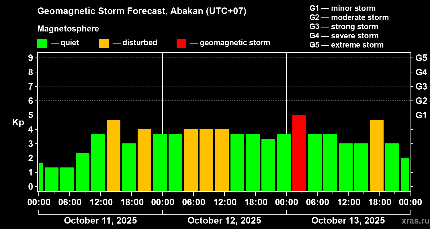 Geomagnetic storm forecast in Abakan for Oct 11, 2025