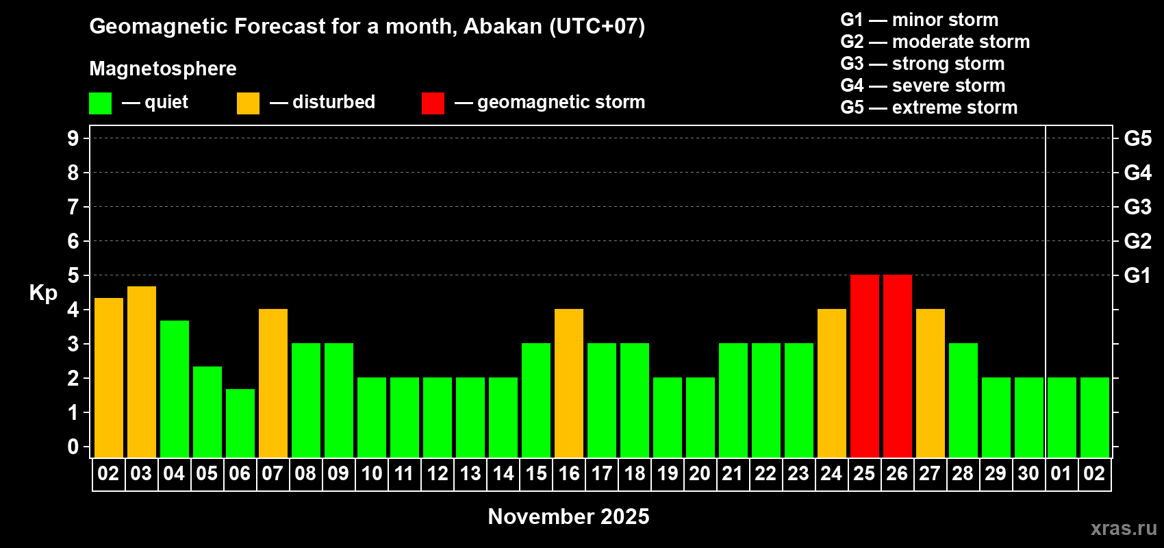 Geomagnetic storm forecast in Abakan for Nov 02, 2025