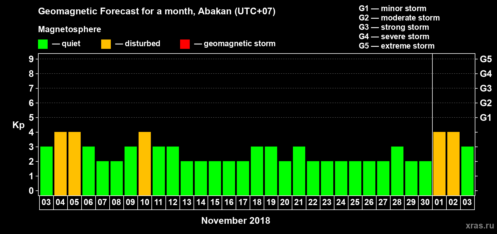 Geomagnetic storm forecast in Abakan for Nov 03, 2018