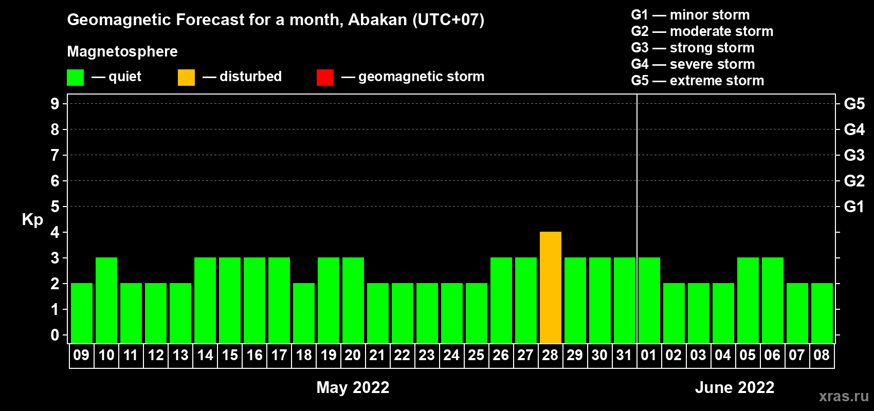 Geomagnetic activity forecast in Abakan — May 09, 2022