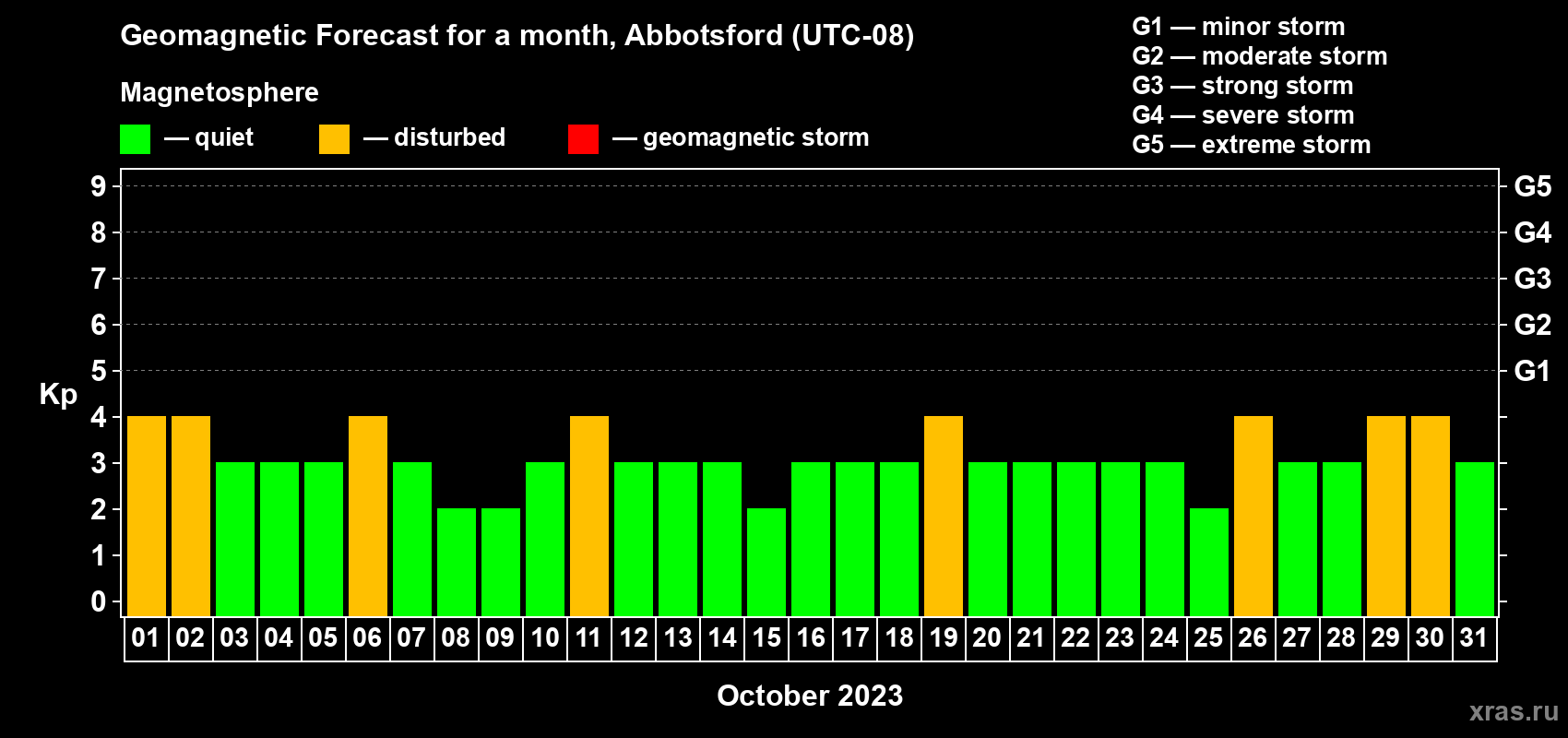 Geomagnetic storm forecast in Abbotsford for Oct 01, 2023