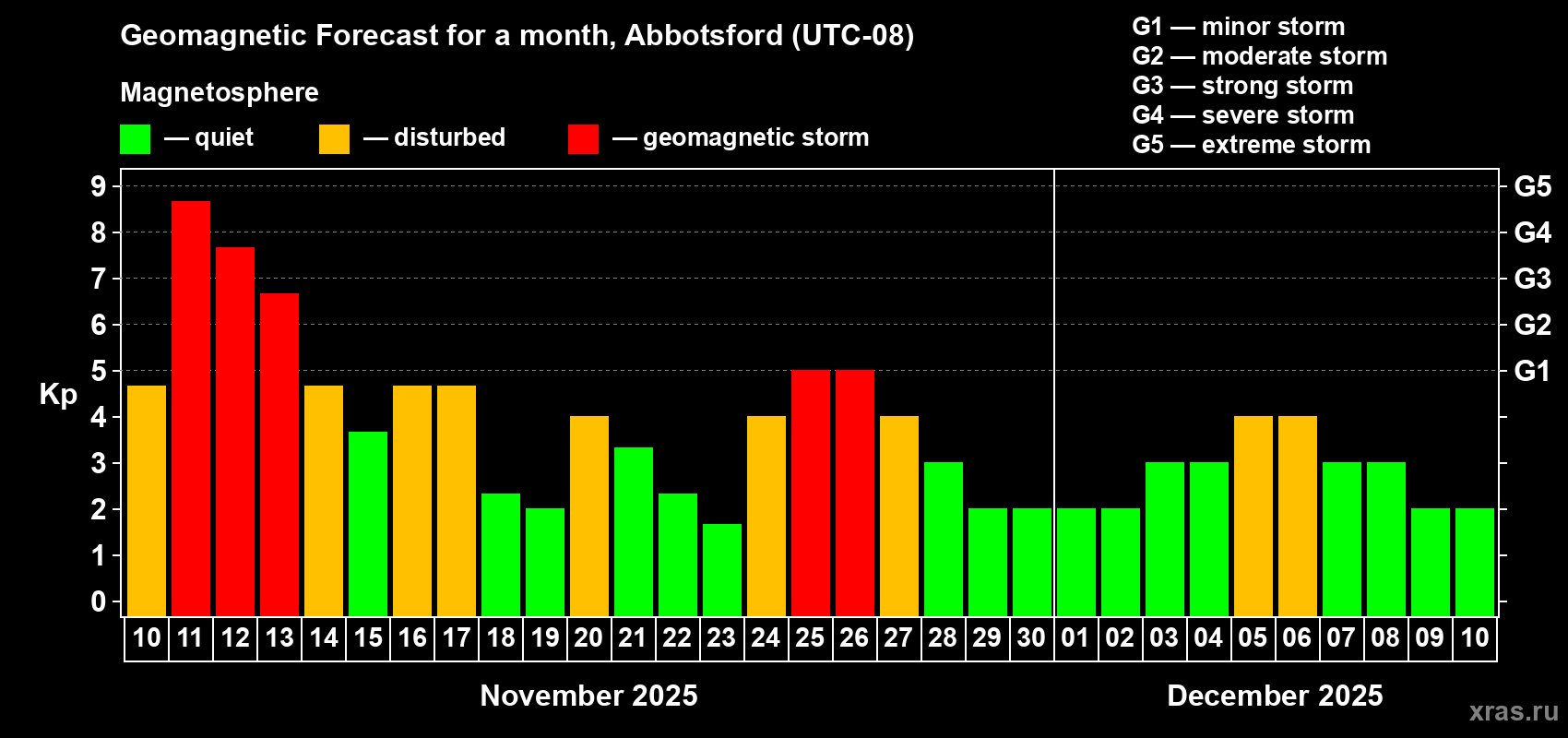 Geomagnetic storm forecast in Abbotsford for Nov 10, 2025