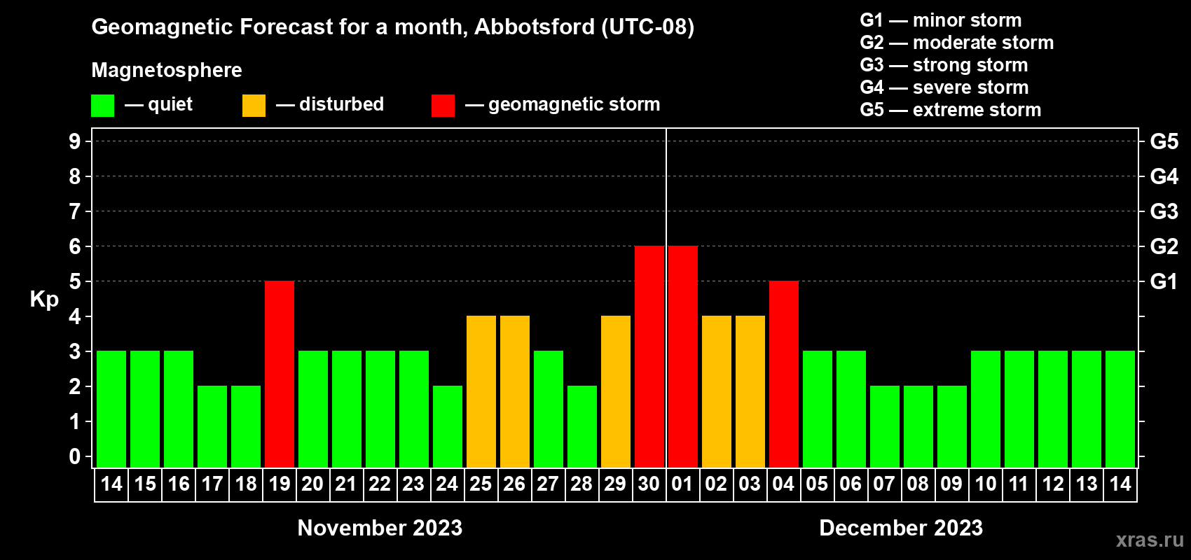 Geomagnetic storm forecast in Abbotsford for Nov 14, 2023