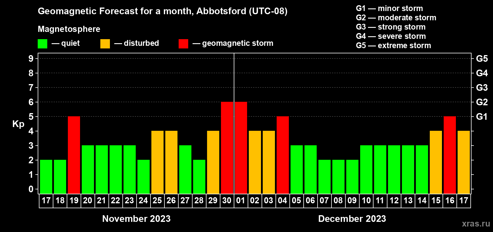 Geomagnetic storm forecast in Abbotsford for Nov 17, 2023