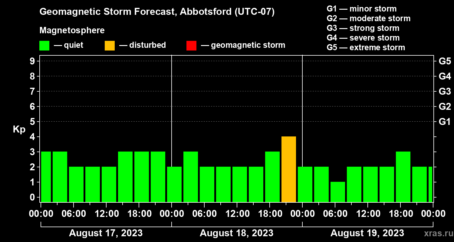 Geomagnetic storm forecast in Abbotsford for Aug 17, 2023